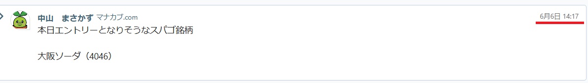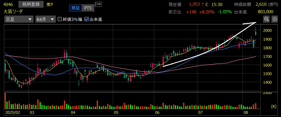 を狙ったような買いが最高値更新の一つの要因になっているものと思われます。また本日の初出し💡は大阪ソーダと物語コーポの2銘柄になります。