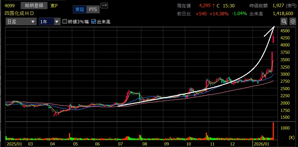 ◆四国化成HD、連日の爆上げで2バガー達成!