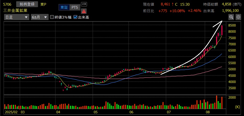 値下がり上位は金属製品、水産農林、倉庫運輸などでした。個別銘柄では6月下旬にエントリーとなった三井金属鉱業が上値追い継続中で+10%の