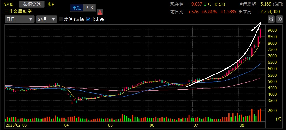 また6月下旬にエントリーとなった三井金属鉱業が連日の上値追い継続でこの日も+7%弱の