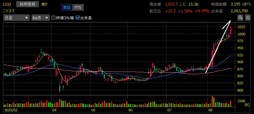 この恩恵を受けいやすい内需関連がしっかりとしてきている印象です。ニッスイももちろんですがその該当銘柄であり、足元7月下旬からの上昇にはまとまった