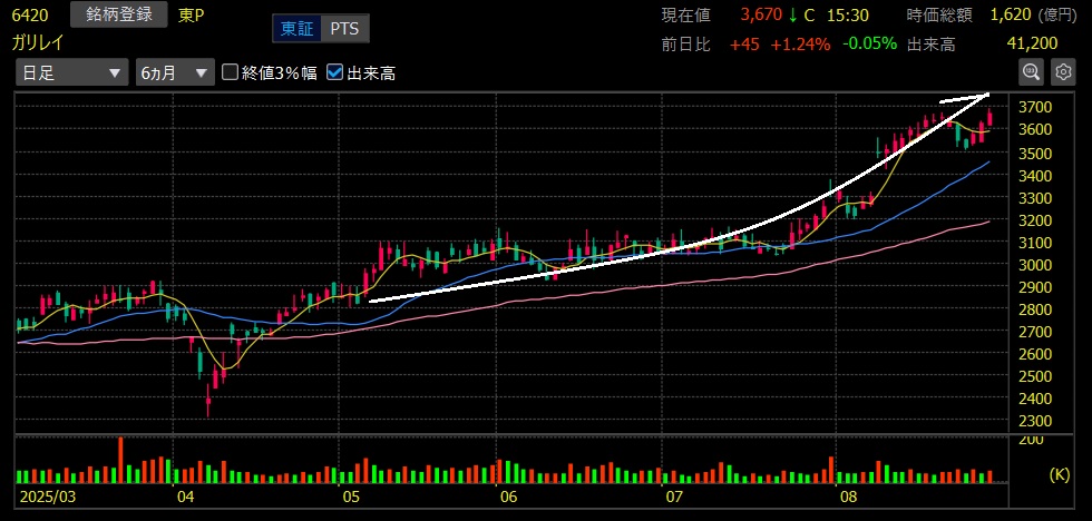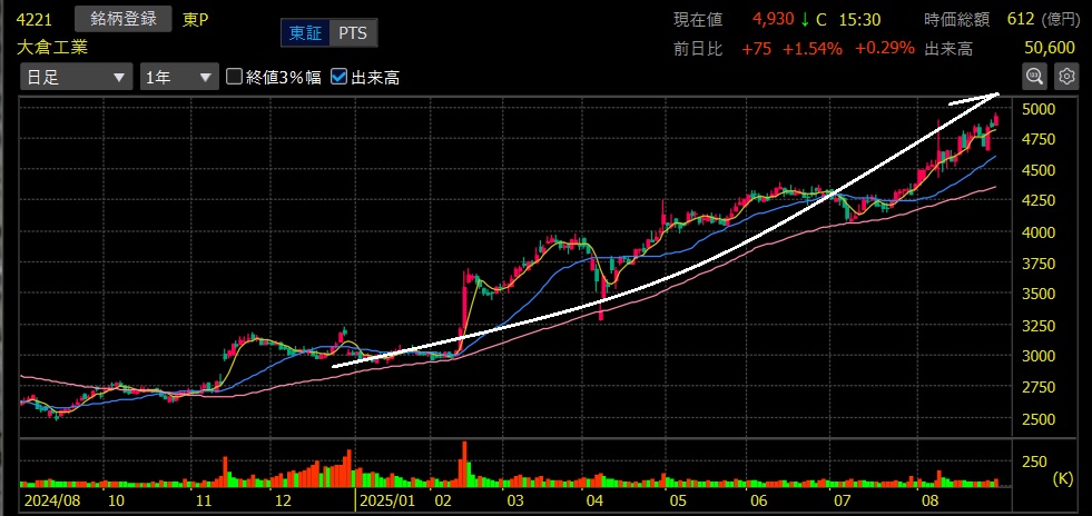 値下がり上位は不動産、保険、輸送用機器などでした。個別銘柄では昨年12月下旬にエントリーとなった大倉工業が足元で上値追いを