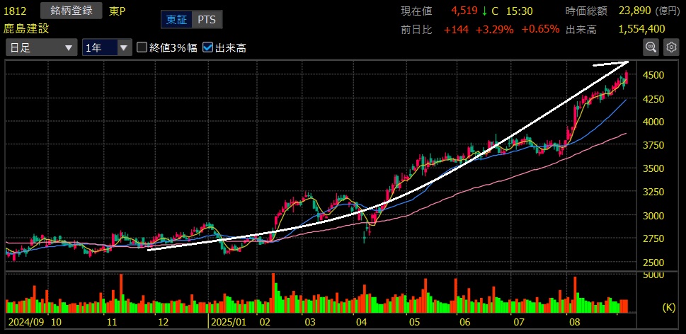値下がり上位は鉱業、ゴム製品、化学などでした。個別銘柄では昨年11月下旬にエントリーとなった鹿島建設が上値追い継続で