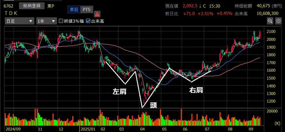 TDKのように左肩→頭(ド底値)→右肩のチャートが形成されたことを確認してから