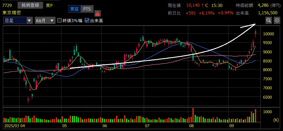個別銘柄では5月初旬にエントリーとなった東京精密が窓を開けて続伸し、