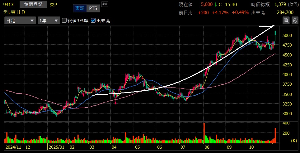 テレビ東京HDはエントリー時から+39%の上昇👍