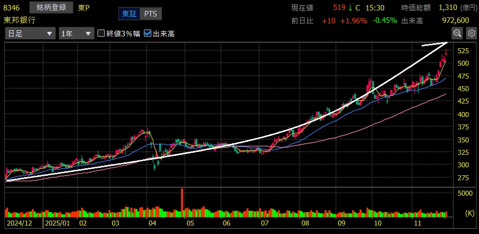 東邦銀行の初出し当初株価はまだ365円でしたので、ここから本日の519円まででも