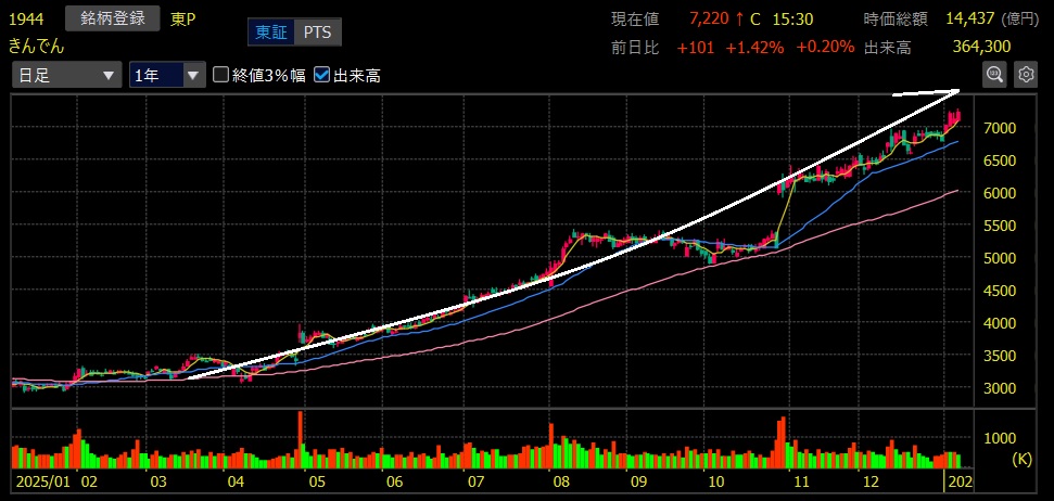 きんでん(1944)+116.9%上昇 上場来高値更新!2バガー達成🎉