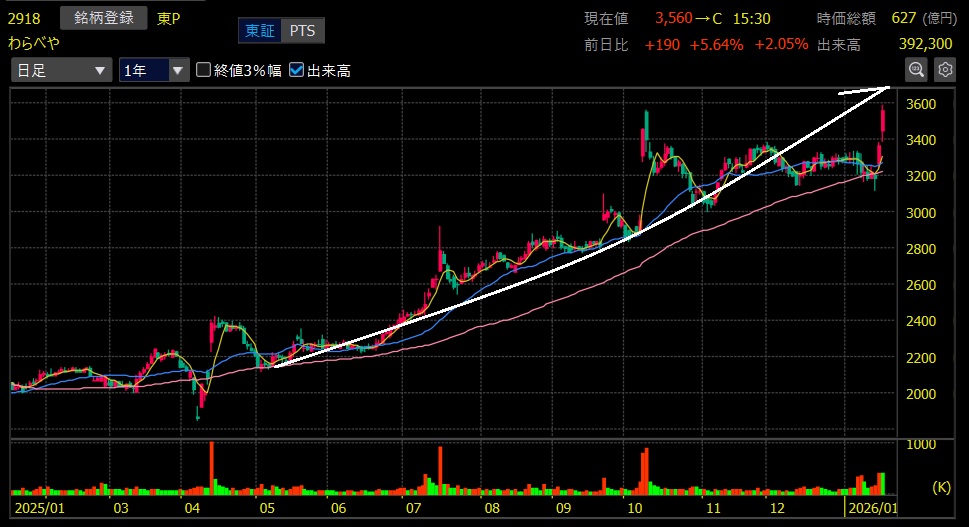 1年来高値、上場来高値更新となってくれました🎉まずはわらべや日洋(2918)です。