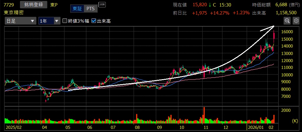 東京精密(7729)+90.2%上昇 上場来高値更新!間もなく2バガー達成🎉