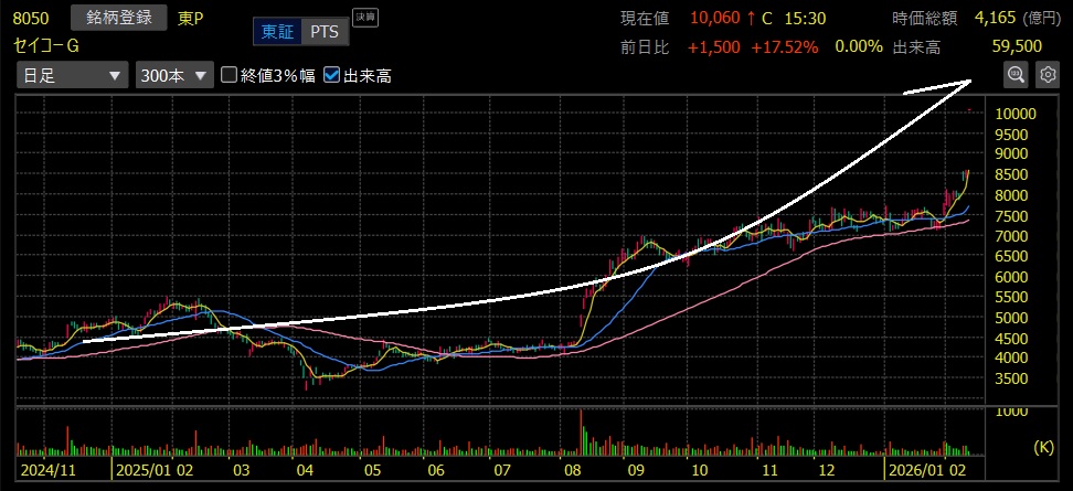セイコーG(8050)+136.7%上昇 上場来高値更新!2バガー達成🎉