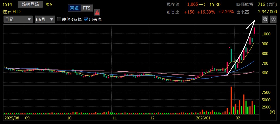 住石HD(1514)+50.2%上昇 超短期ハーフバガー倍達成🎉