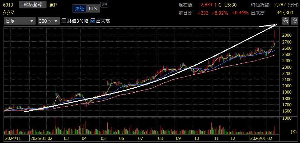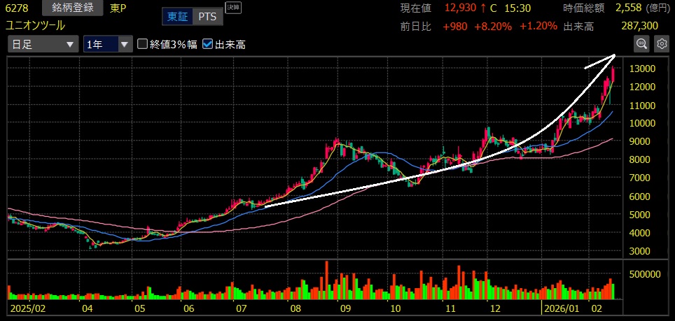 また過去に何度もご紹介しているタクマ、ユニオンツールも再び上場来高値を更新し、それぞれ